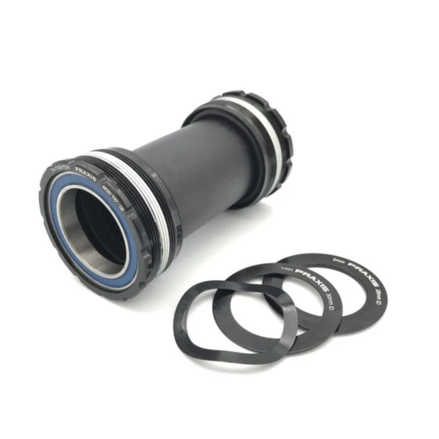 Le boîtier de pédalier fileté Praxis T47i s’adapte parfaitement aux cadres route Trek. Large de 85,5 mm, il est doté de roulements en acier et de coupelles en alliage forgé et usiné traité thermiquement. Il est compatible avec les pédaliers Praxis M30. Une rondelle ondulée côté transmission est utilisée pour la précharge des roulements.